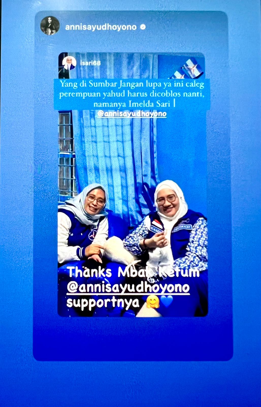 Annisa Yudhoyono di akun instagram nya menukilkan, “Yang di Sumbar jangan lupa ya ini Caleg Perempuan yahud harus dicoblos nanti, namanya Imelda Sari’. “ seperti yg termuat dari story IG nya.