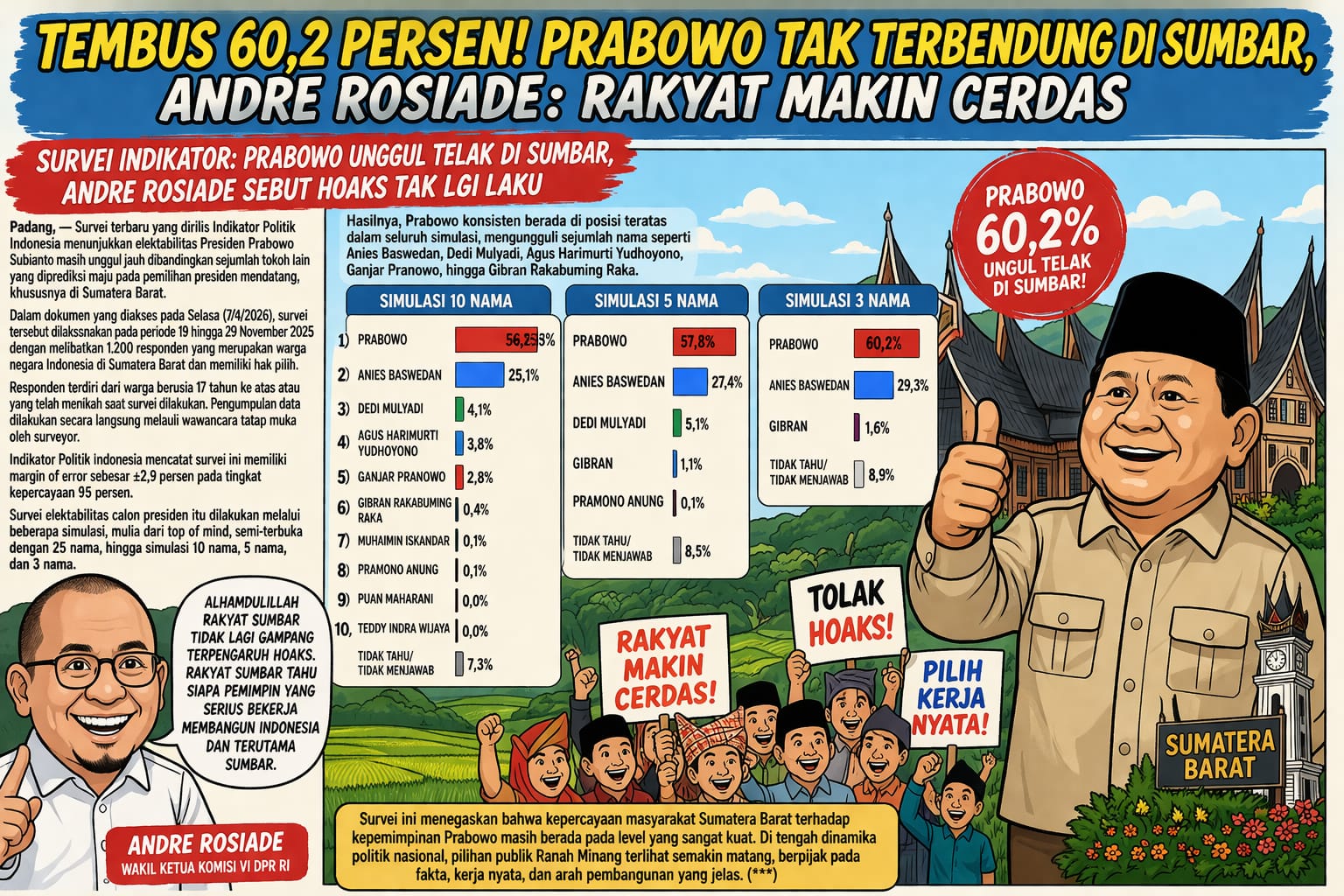 Menanggapi hasil survei tersebut, Wakil Ketua Komisi VI DPR RI Andre Rosiade menilai tingginya dukungan masyarakat Sumatera Barat kepada Prabowo menunjukkan publik semakin cerdas dalam menilai kepemimpinan nasional.
